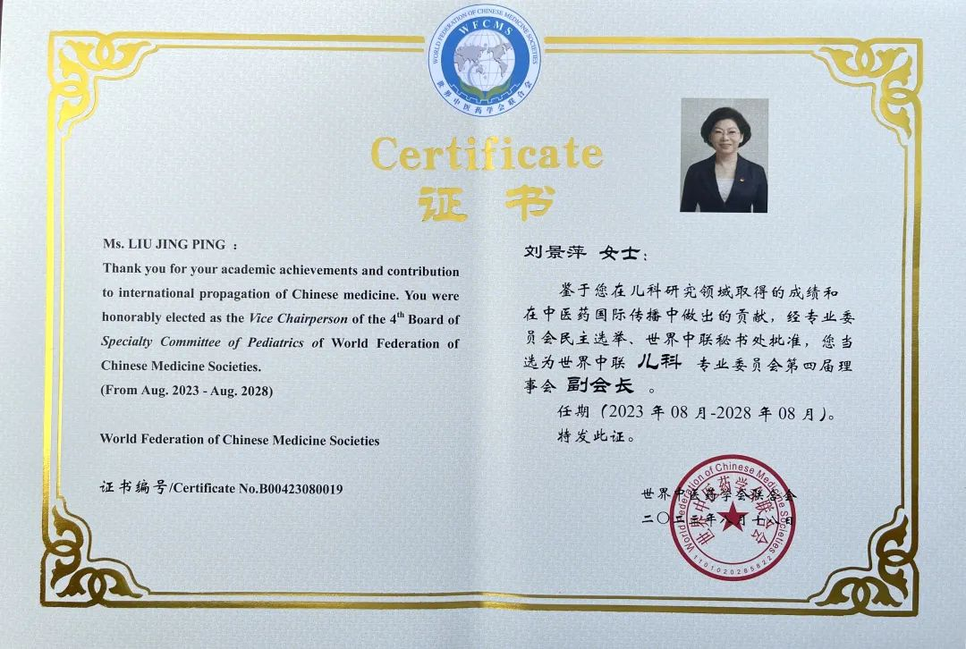 泛亚电竞药业集团党委书记、董事长刘景萍当选世界中医药学会联合会儿科专业委员会第四届理事会副会长